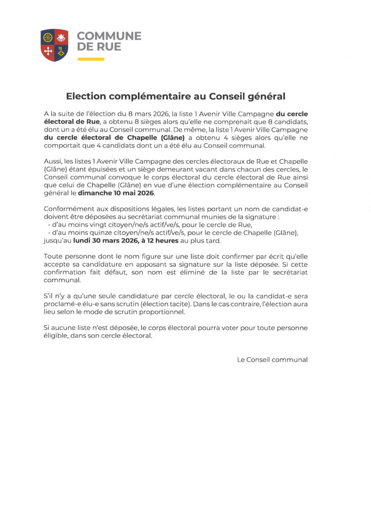 mars 20, 2026 - Dans Administration Par Comm-Rue Comment off Election complémentaire au Conseil général Précédent Cercle électoral de Rue – Information second tour élection communale Suivant Tirs obligatoires 2026